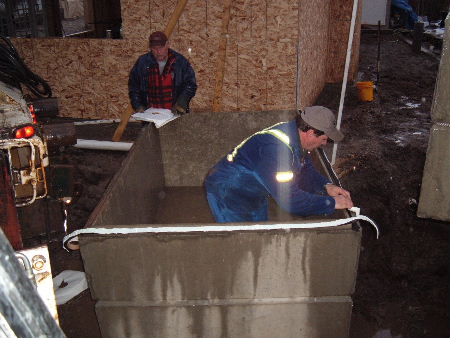 | Joe from South Okanagan Concrete Products installs con-seal on the tank joint of this two piece, single compartment tank prior to installation | |||||||||||||||||||||||||