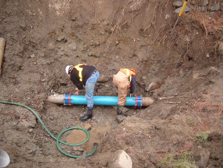 | We do excavations for water main repairs Work crew tightens couplings on 8 inch main |